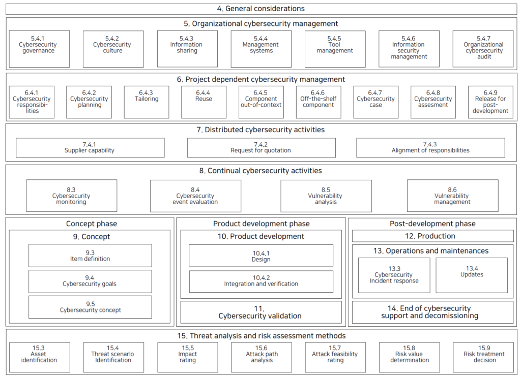 ISO/SAE 21434는 15개 조항으로 구성됩니다.