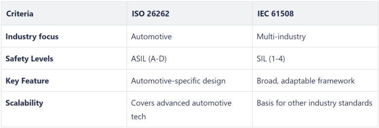 두 표준 모두 인간의 안전을 보장한다는 동일한 목표를 공유합니다. 차이점은 ISO 26262가 자동차 산업의 구체적이고 엄격한 요구 사항을 충족하기 위해 더 깊이 파고든다는 점입니다.