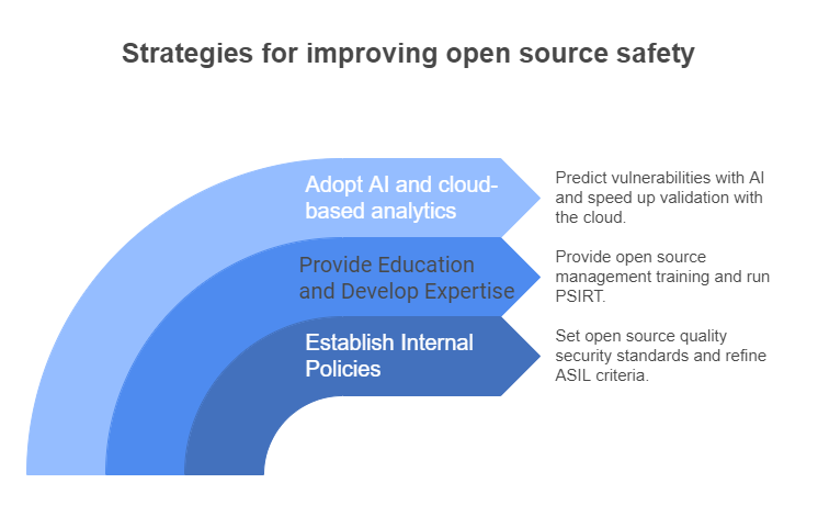 오픈소스는 개발 속도를 높이고 유지 관리 비용을 줄이는 등 많은 이점을 제공합니다. 그러나 ISO 26262와 같은 안전 표준을 준수하는 것이 필수적인 자동차와 같은 산업에서는 품질과 안전을 보장하는 것이 최우선 과제가 됩니다.